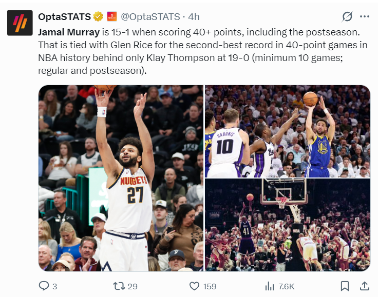 此役贾马尔-穆雷一战创造多项纪录:1.他生涯拿到40+的比赛15胜1负与格伦-瑞斯并列历史第二,仅次于克莱19次40+拿到19胜0负。