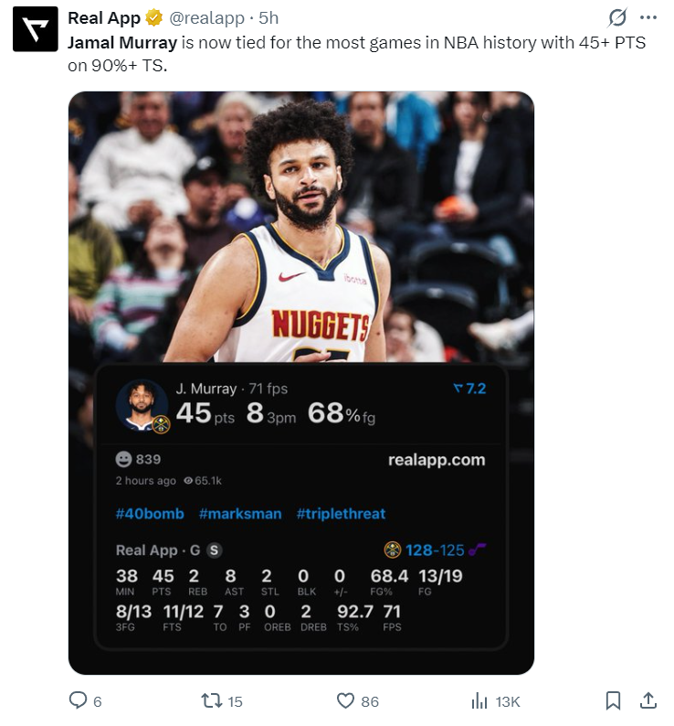3.掘金本赛季拿到45分以上真实命中率超过90%的球员有三人:约基奇、穆雷(2次)、戈登;