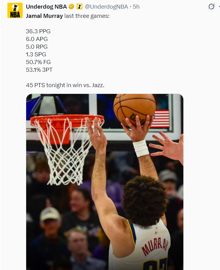 过去三场比赛穆雷场均36.3分6助攻5篮板1.3抢断, 命中率50.7%,三分命中率53.1%,场均5.67个三分球。